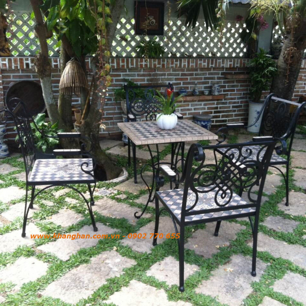 Sản phẩm ngoại thất sân vườn sẽ có điểm thu hút riêng đặc biệt nhờ chất liệu và cụm hoa văn duyên dáng tạo nên một tổng thể hài hòa và lạ mắt bởi sự kết hợp độc đáo từ sắt rèn và gạch Mosaic