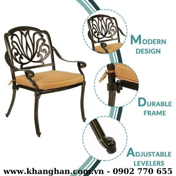 Với thiết kế tinh tế, mẫu bàn ghế sân vườn ngoài trời bằng nhôm đúc này không chỉ đem lại vẻ đẹp sang trọng mà còn đảm bảo tính bền vững. Chất liệu nhôm đúc chắc chắn giúp sản phẩm đáp ứng được yêu cầu an toàn và độ bền cao trong mọi điều kiện thời tiết. Với bộ bàn ghế nhôm đúc này, bạn có thể yên tâm tận hưởng một không gian tiện nghi ngoài trời của mình một cách tuyệt vời nhất.