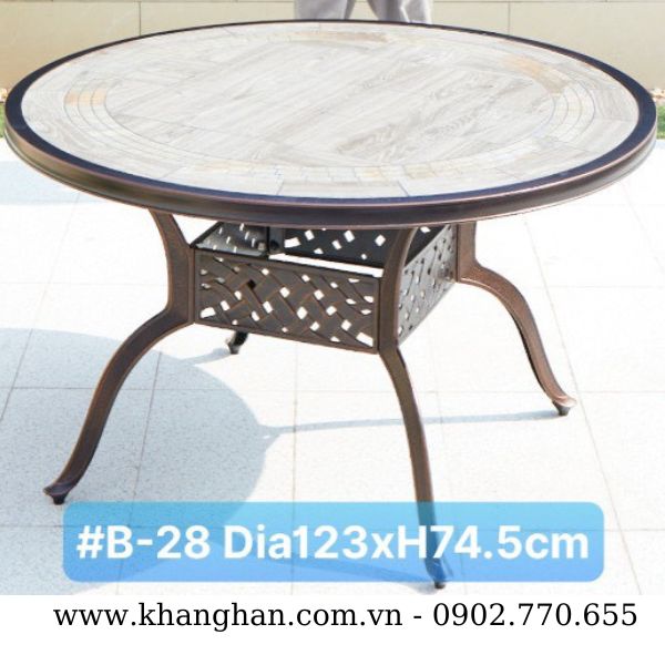 Mẫu bàn tròn nhôm đúc mặt gốm là một tác phẩm nghệ thuật tinh tế và đẳng cấp, hoàn thiện về mặt thẫm mỹ và hoà mình vào không gian thiên nhiên của sân vườn. Với thiết kế bàn tròn sắc nét, mang đậm chất tân cổ điển, sản phẩm được làm bằng chất liệu nhôm đúc chất lượng cao và gốm sứ. Mỗi chi tiết nhỏ trên bề mặt bàn được chăm chút tỉ mỉ, tạo nên một cái nhìn hài hòa và tinh tế.